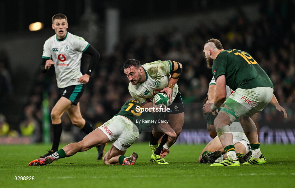22 November 2025; Rónan Kelleher of Ireland is tackled by Jesse Kriel of South Africa during the Quilter Nations Series 2025 match between Ireland and South Africa at the Aviva Stadium in Dublin. Photo by Ramsey Cardy/Sportsfile
