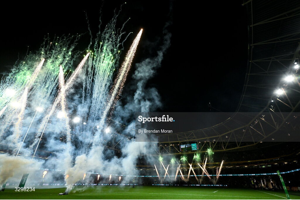 22 November 2025; Fireworks explode as the teams make their way onto the pitch before the Quilter Nations Series 2025 match between Ireland and South Africa at the Aviva Stadium in Dublin. Photo by Brendan Moran/Sportsfile