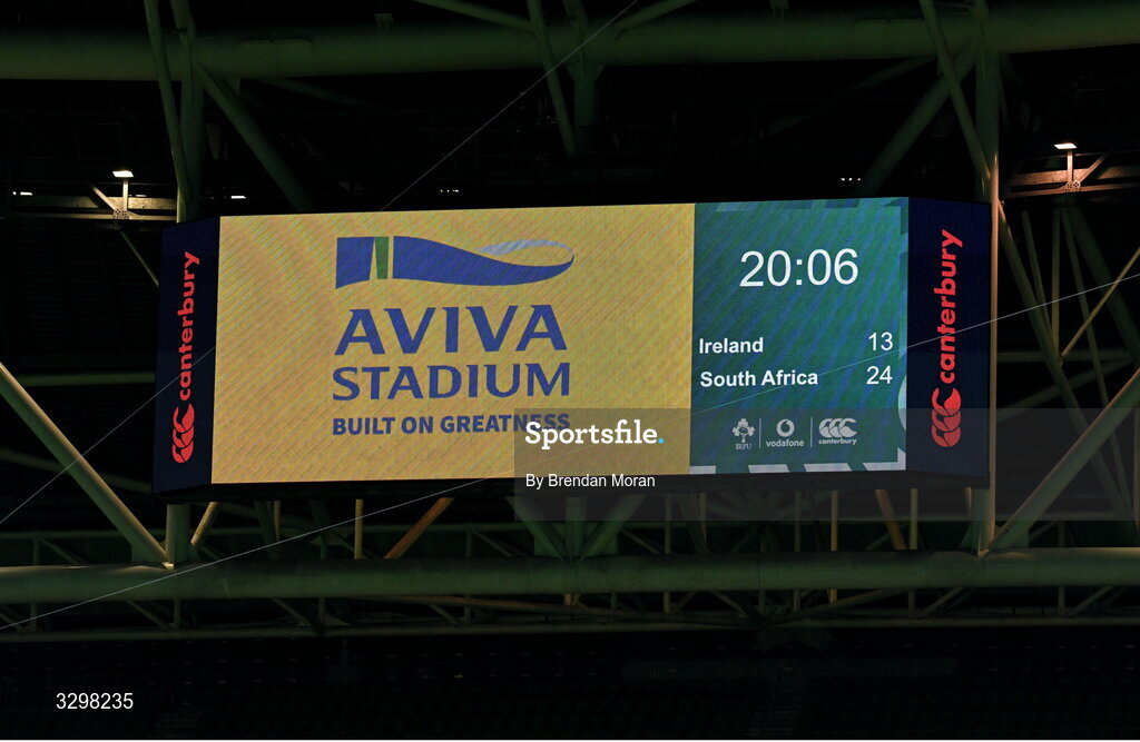 22 November 2025; The final score on the big screen after the Quilter Nations Series 2025 match between Ireland and South Africa at the Aviva Stadium in Dublin. Photo by Brendan Moran/Sportsfile