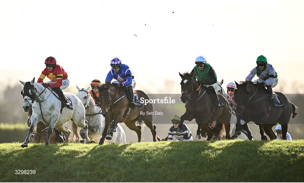 23 November 2025; Desertmore House, second from right, with Ricky Doyle up, jumps Ruby's Double on their way to winning the Colm Quinn BMW Risk Of Thunder Steeplechase during day two of the Punchestown Premiere Weekend at Punchestown Racecourse in Kildare. Photo by Seb Daly/Sportsfile