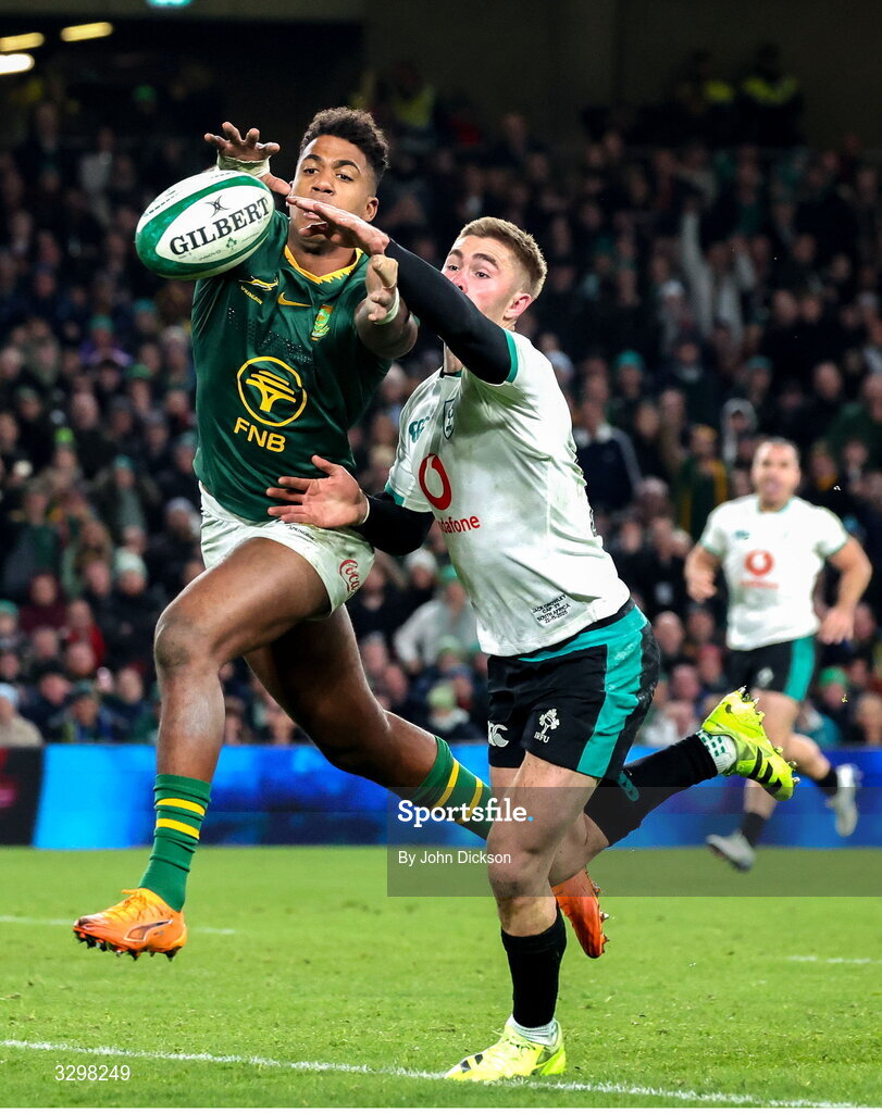 22 November 2025; Jack Crowley of Ireland tips the ball away from Canan Moodie of South Africa preventing a try during the Quilter Nations Series 2025 match between Ireland and South Africa at the Aviva Stadium in Dublin. Photo by John Dickson/Sportsfile