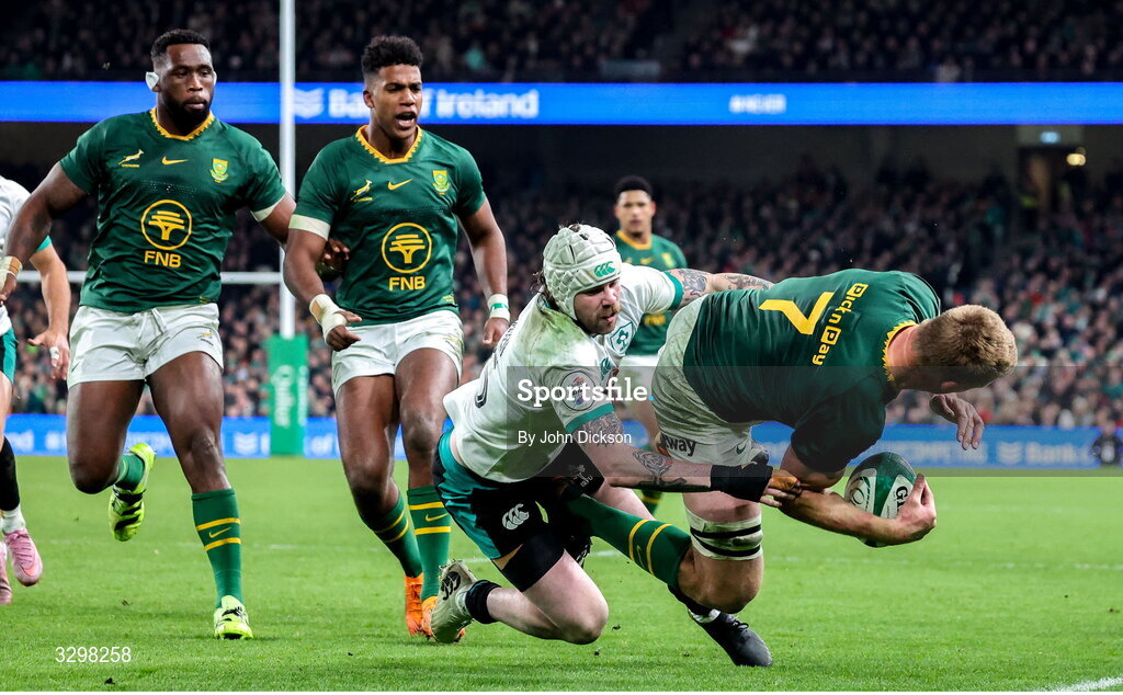 22 November 2025; Pieter-Steph du Toit of South Africa is tackled by Mack Hansen of Ireland during the Quilter Nations Series 2025 match between Ireland and South Africa at the Aviva Stadium in Dublin. Photo by John Dickson/Sportsfile
