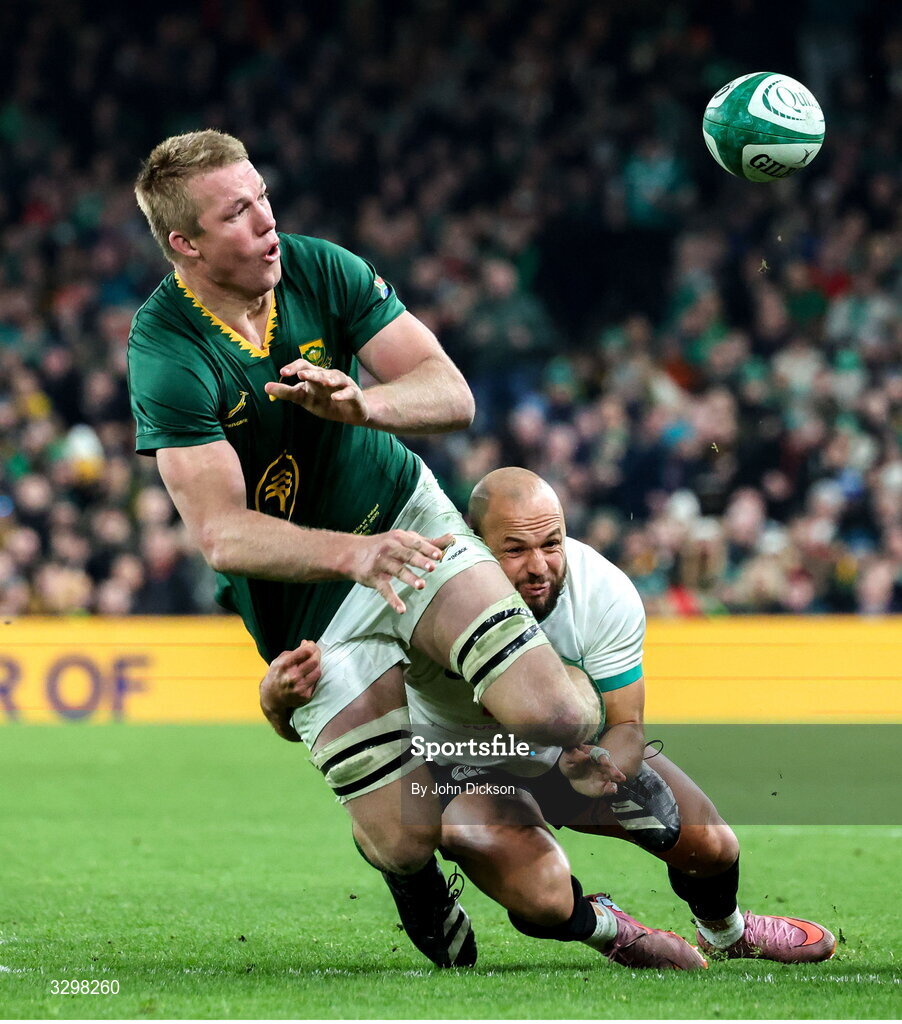 22 November 2025; Pieter-Steph du Toit of South Africa is tackled by Jamison Gibson-Park of Ireland during the Quilter Nations Series 2025 match between Ireland and South Africa at the Aviva Stadium in Dublin. Photo by John Dickson/Sportsfile