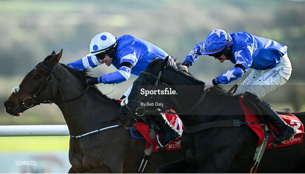 23 November 2025; Champagne Kid, right, with Eoghan Finegan up, on their way to winning the Irish Stallion Farms EBF Maiden Hurdle, from second place Court Compliance, left, with Philip Byrnes up, during day two of the Punchestown Premiere Weekend at Punchestown Racecourse in Kildare. Photo by Seb Daly/Sportsfile