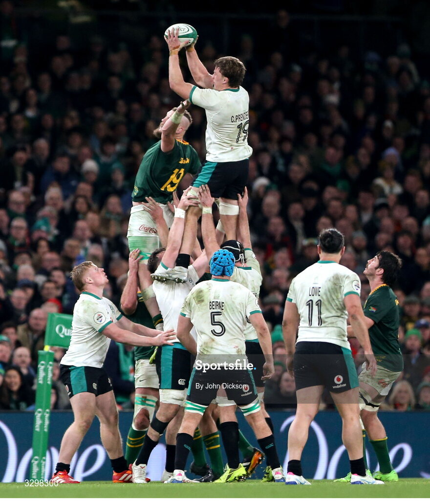 22 November 2025; Cian Prendergast of Ireland battle for possession in a line-out during the Quilter Nations Series 2025 match between Ireland and South Africa at the Aviva Stadium in Dublin. Photo by John Dickson/Sportsfile