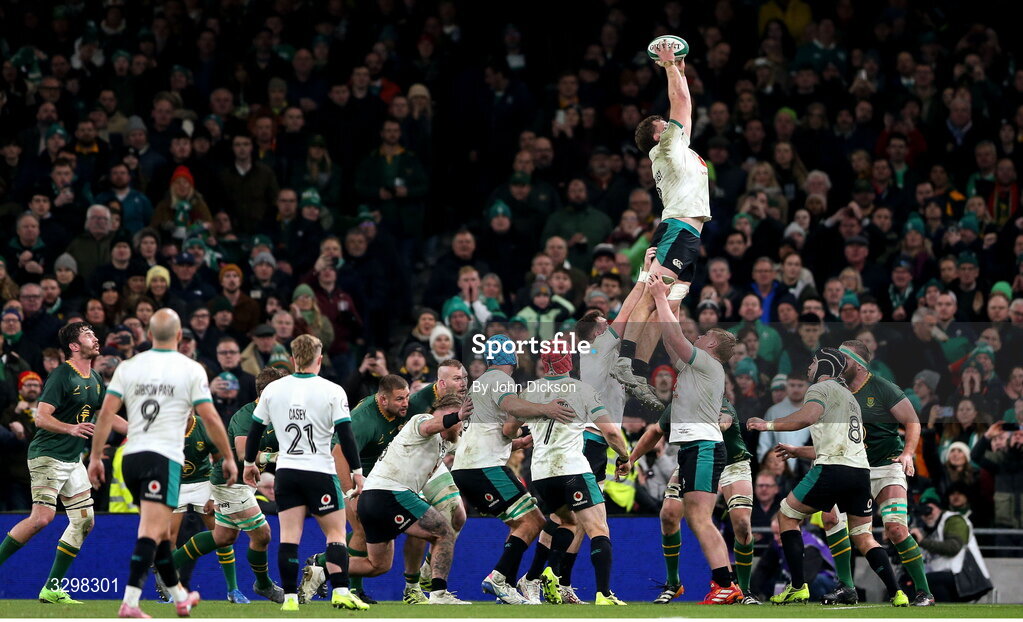 22 November 2025; Cian Prendergast of Ireland battle for possession in a line-out during the Quilter Nations Series 2025 match between Ireland and South Africa at the Aviva Stadium in Dublin. Photo by John Dickson/Sportsfile