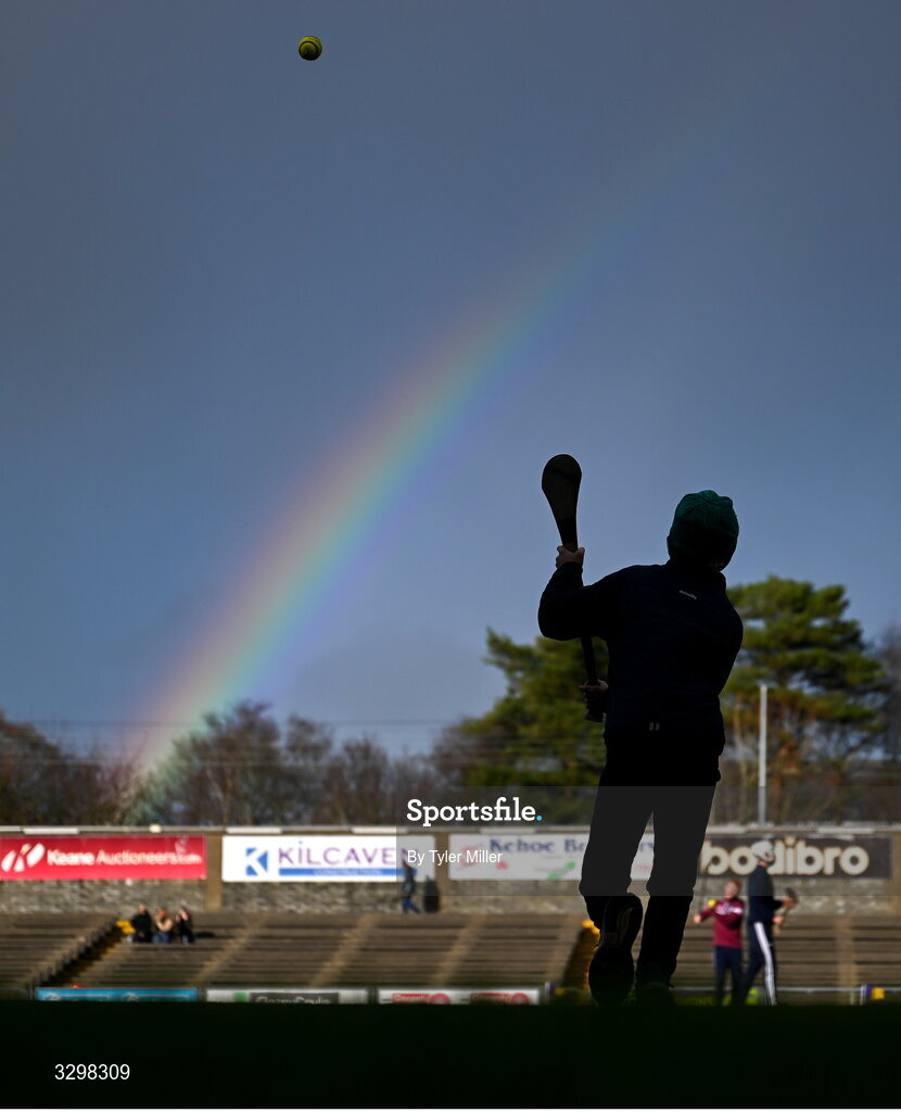 23 November 2025; A young supporter practices on the pitch as a rainbow is seen before the AIB Leinster GAA Hurling Senior Club Championship semi-final match between St Martin's and Naas at Chadwicks Wexford Park in Wexford. Photo by Tyler Miller/Sportsfile
