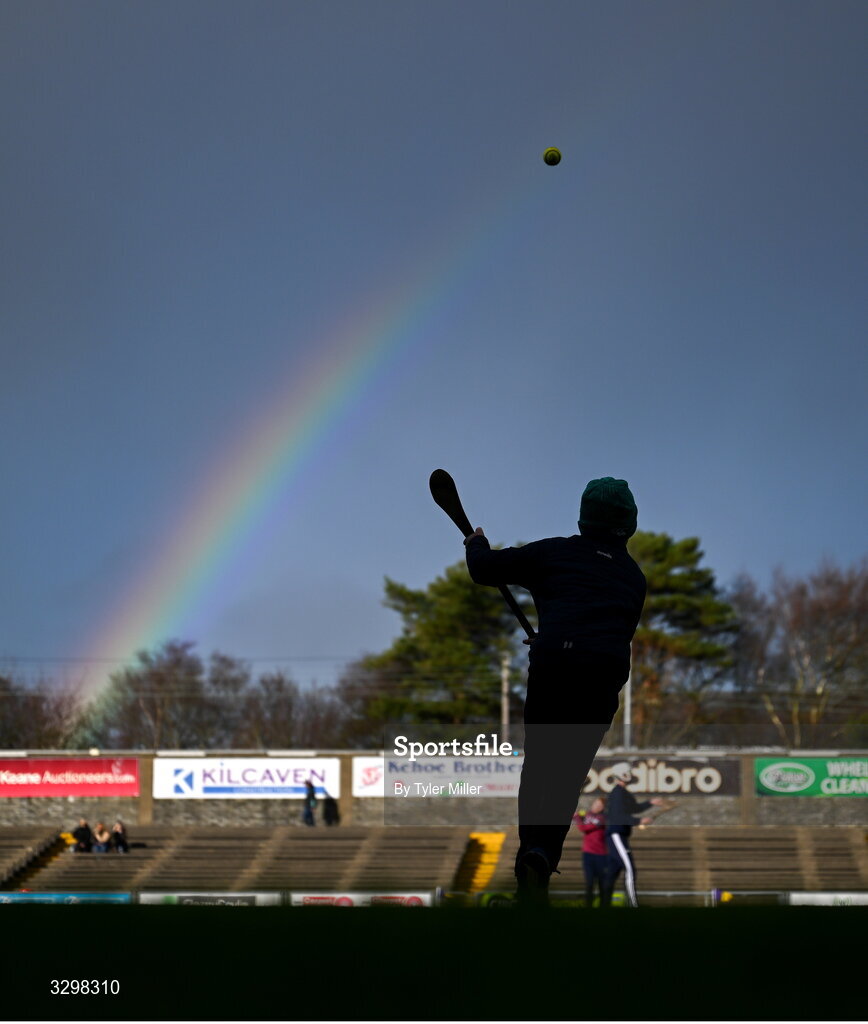 23 November 2025; A young supporter practices on the pitch as a rainbow is seen before the AIB Leinster GAA Hurling Senior Club Championship semi-final match between St Martin's and Naas at Chadwicks Wexford Park in Wexford. Photo by Tyler Miller/Sportsfile