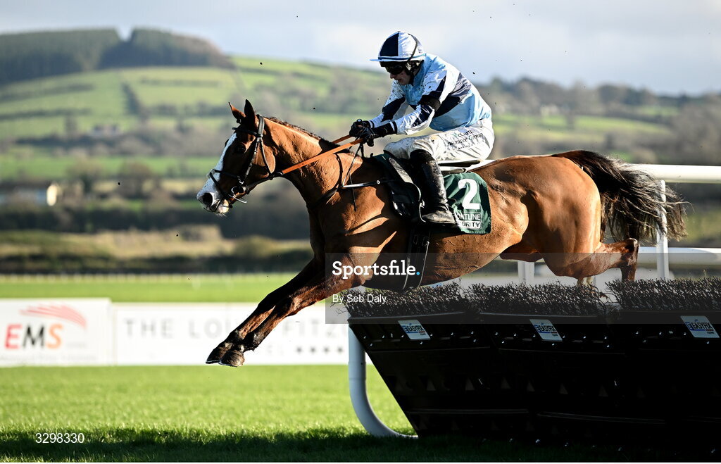 23 November 2025; Feet Of A Dancer, with Sean O'Keeffe up, jumps the last on their way to winning the Frontline Security Grabel Mares Hurdle during day two of the Punchestown Premiere Weekend at Punchestown Racecourse in Kildare. Photo by Seb Daly/Sportsfile