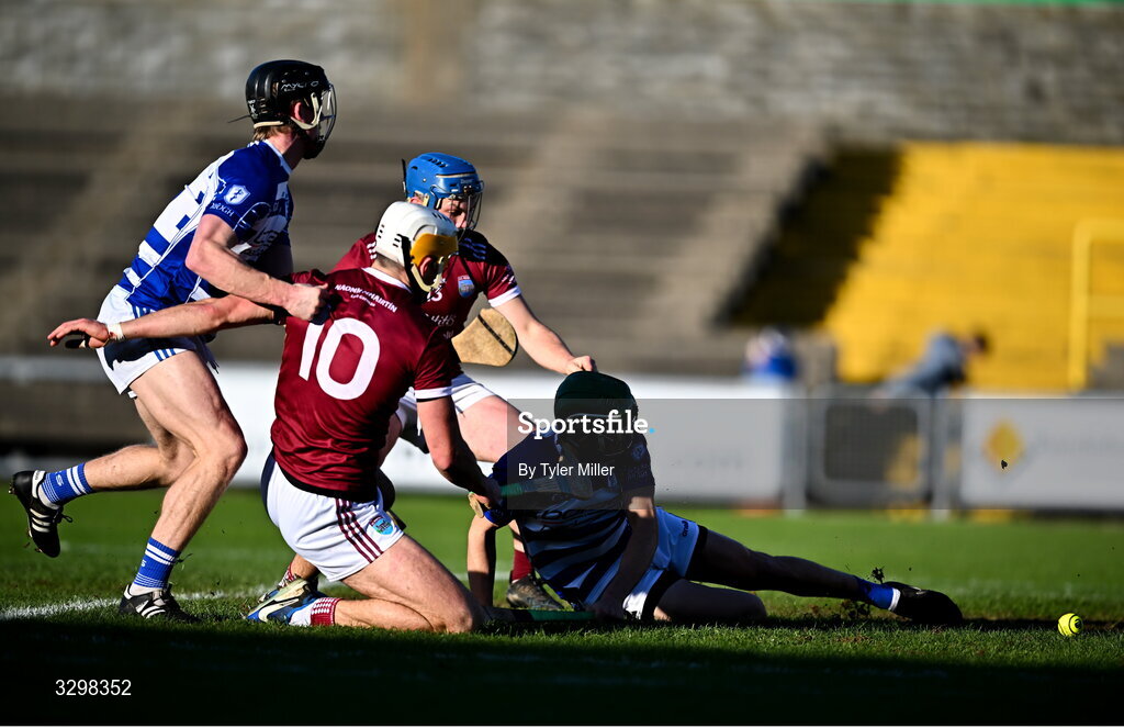 23 November 2025; Barry O'Connor of St Martin's, 10, hits the sliotar ahead of Peter O'Donoghue, right, and Rian Boran of Naas during the AIB Leinster GAA Hurling Senior Club Championship semi-final match between St Martin's and Naas at Chadwicks Wexford Park in Wexford. Photo by Tyler Miller/Sportsfile