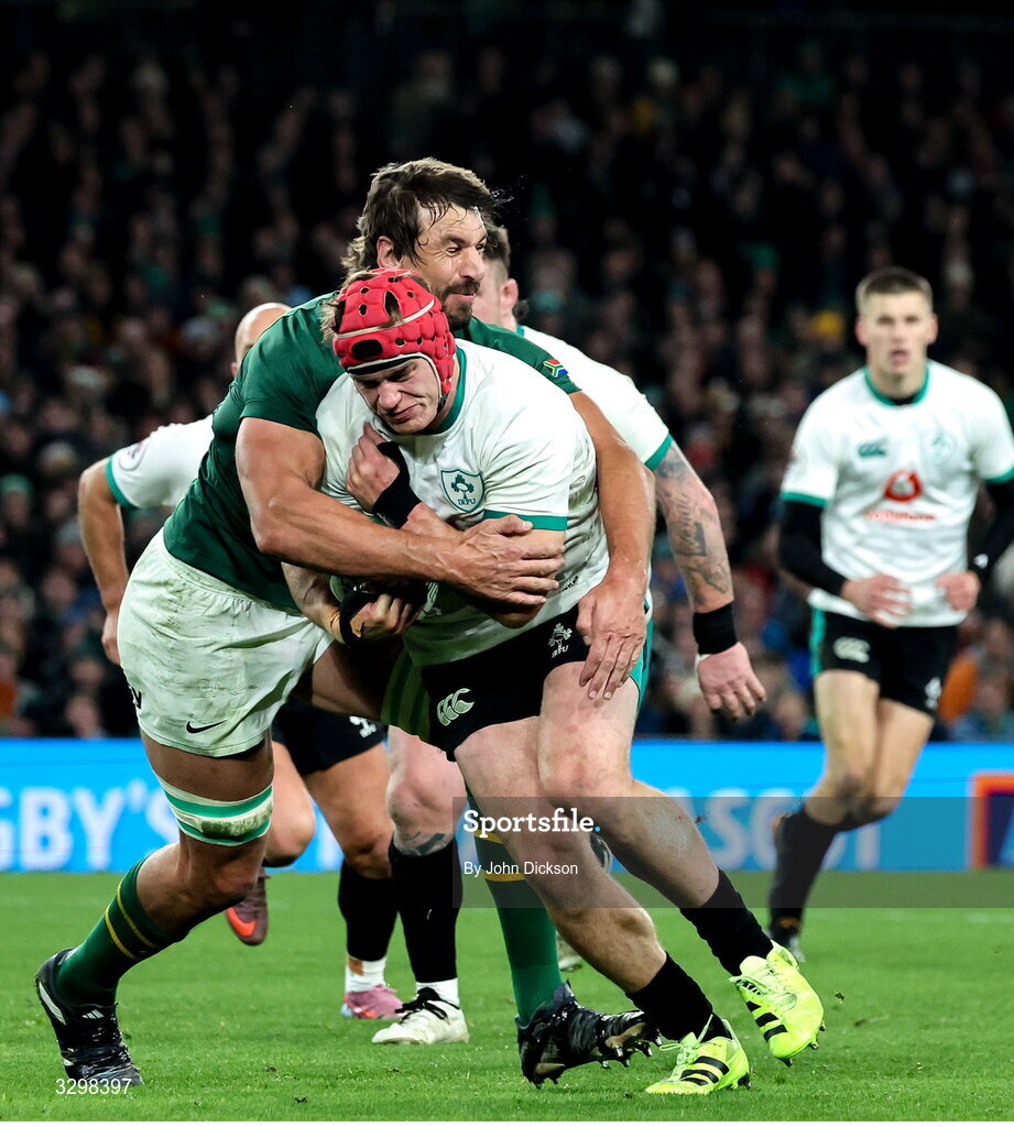 22 November 2025; Josh van der Flier of Irelan is tackled by Eben Etzebeth of South Africa during the Quilter Nations Series 2025 match between Ireland and South Africa at the Aviva Stadium in Dublin. Photo by John Dickson/Sportsfile