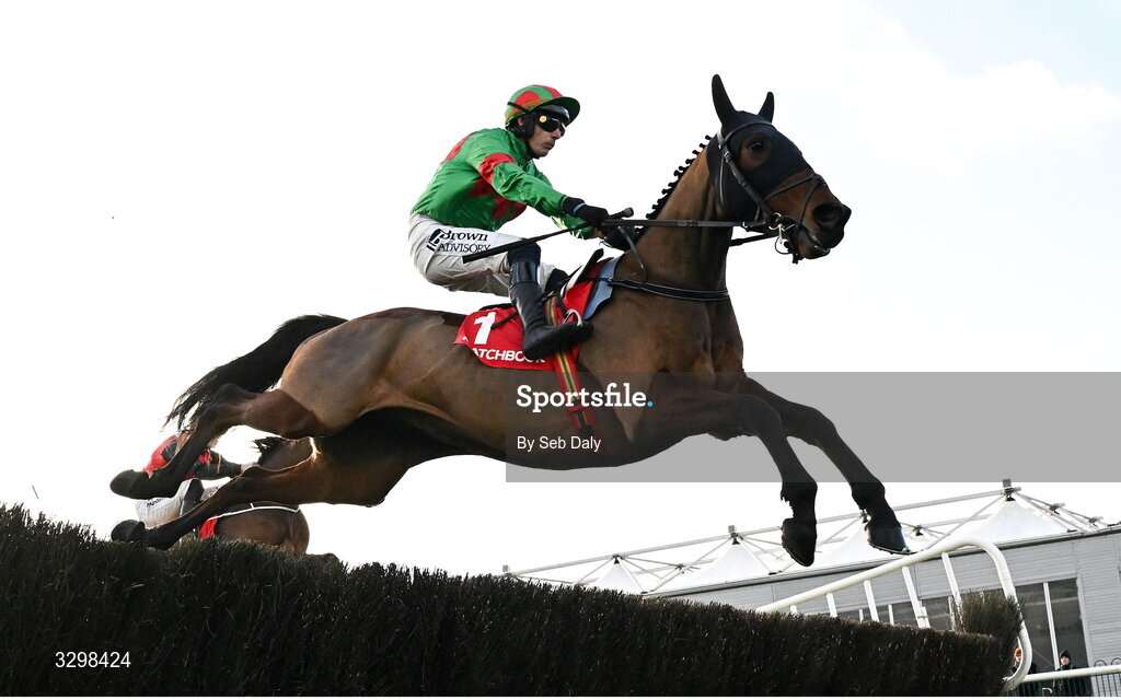 23 November 2025; Westport Cove, with Paul Townend up, jumps the first on their way to winning the Matchbook Betting Exchange Craddockstown Novice Steeplechase during day two of the Punchestown Premiere Weekend at Punchestown Racecourse in Kildare. Photo by Seb Daly/Sportsfile