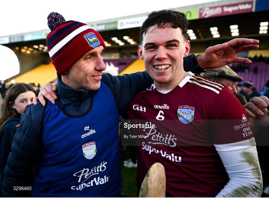 23 November 2025; St Martin's manager Daithí Hayes and Philip Dempsey of St Martin's after the AIB Leinster GAA Hurling Senior Club Championship semi-final match between St Martin's and Naas at Chadwicks Wexford Park in Wexford. Photo by Tyler Miller/Sportsfile
