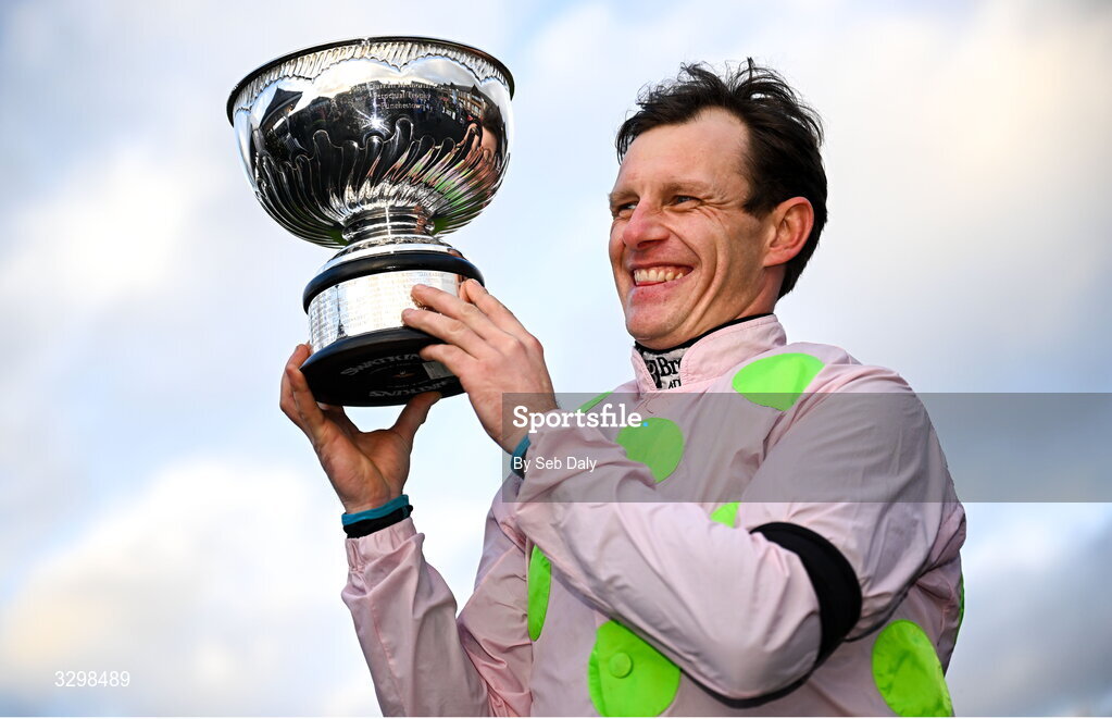 23 November 2025; Jockey Paul Townend celebrates with the trophy after winning the John Durkan Memorial Punchestown Steeplechase on Gaelic Warrior during day two of the Punchestown Premiere Weekend at Punchestown Racecourse in Kildare. Photo by Seb Daly/Sportsfile
