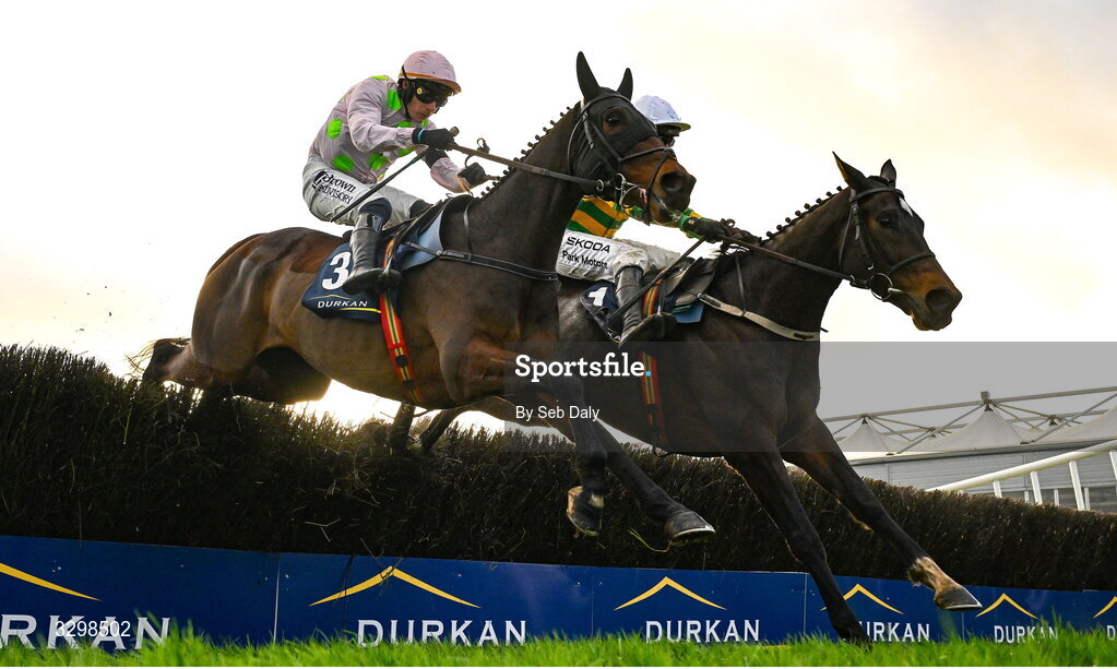 23 November 2025; Gaelic Warrior, left, with Paul Townend up, jumps the last on their way to winning the John Durkan Memorial Punchestown Steeplechase, from second place Fact To File, right, with Mark Walsh up, during day two of the Punchestown Premiere Weekend at Punchestown Racecourse in Kildare. Photo by Seb Daly/Sportsfile