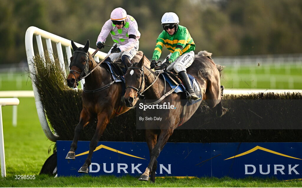 23 November 2025; Fact To File, right, with Mark Walsh up, jumps the last on their way to finishing second, from eventual first place Gaelic Warrior, left, with Paul Townend up, during the John Durkan Memorial Punchestown Steeplechase during day two of the Punchestown Premiere Weekend at Punchestown Racecourse in Kildare. Photo by Seb Daly/Sportsfile