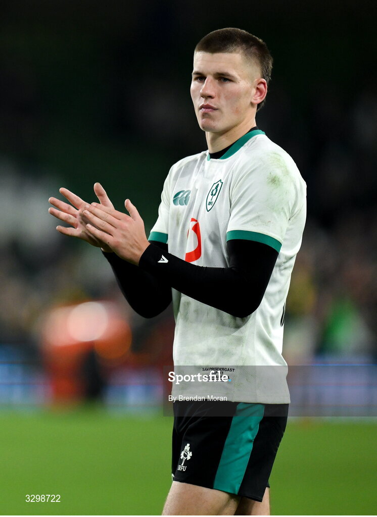 22 November 2025; Sam Prendergast of Ireland after the Quilter Nations Series 2025 match between Ireland and South Africa at the Aviva Stadium in Dublin. Photo by Brendan Moran/Sportsfile