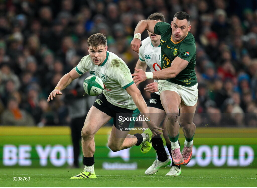 22 November 2025; Garry Ringrose of Ireland and Jesse Kriel of South Africa race for a loose ball during the Quilter Nations Series 2025 match between Ireland and South Africa at the Aviva Stadium in Dublin. Photo by Brendan Moran/Sportsfile