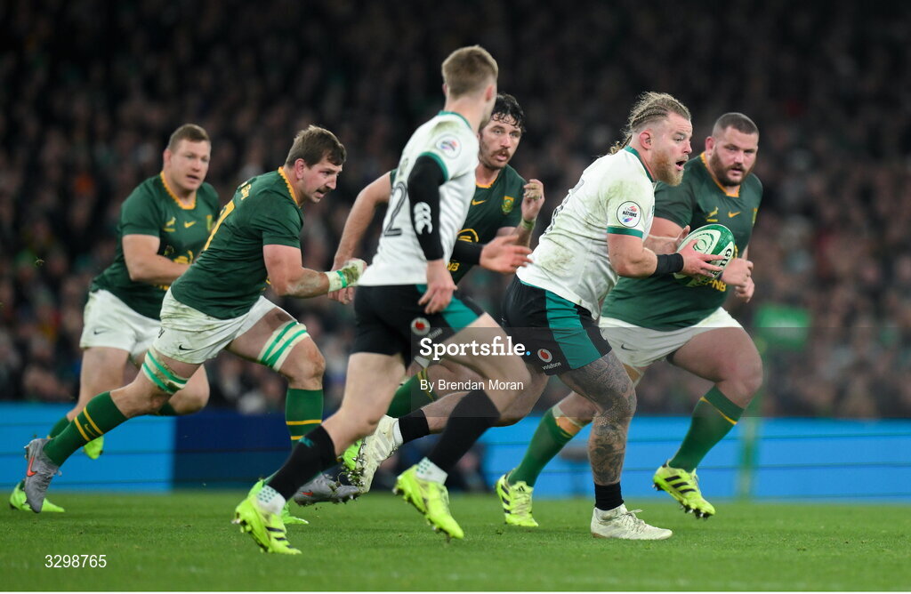 22 November 2025; Finlay Bealham of Ireland makes a break during the Quilter Nations Series 2025 match between Ireland and South Africa at the Aviva Stadium in Dublin. Photo by Brendan Moran/Sportsfile