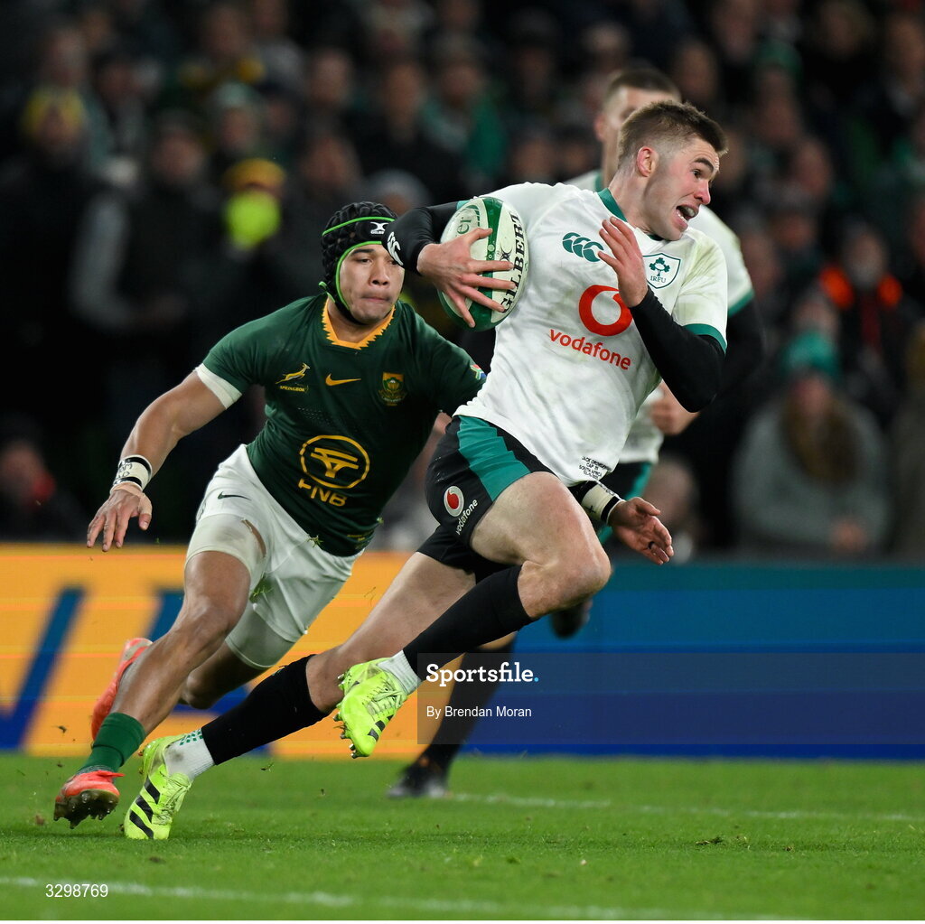 22 November 2025; Jack Crowley of Ireland breaks away from Cheslin Kolbe of South Africa during the Quilter Nations Series 2025 match between Ireland and South Africa at the Aviva Stadium in Dublin. Photo by Brendan Moran/Sportsfile