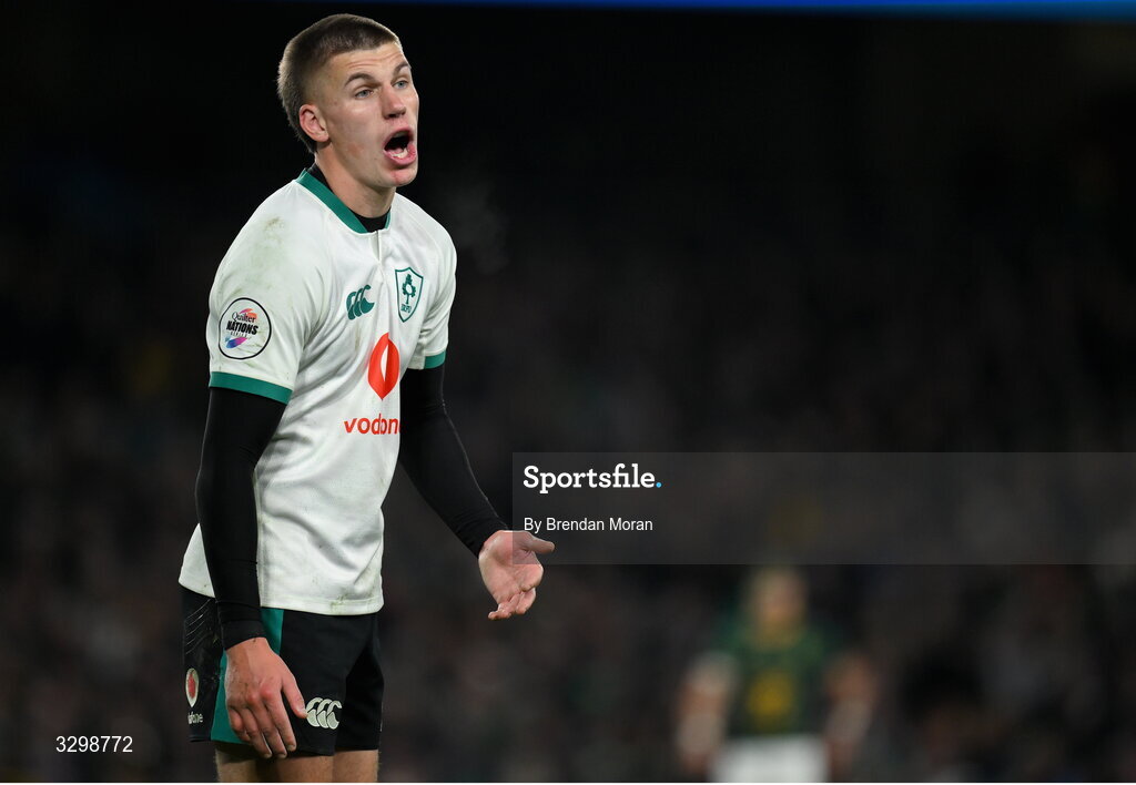22 November 2025; Sam Prendergast of Ireland during the Quilter Nations Series 2025 match between Ireland and South Africa at the Aviva Stadium in Dublin. Photo by Brendan Moran/Sportsfile