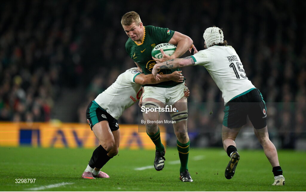 22 November 2025; Pieter-Steph du Toit of South Africa is tackled by Jamison Gibson-Park, left, and Mack Hansen of Ireland during the Quilter Nations Series 2025 match between Ireland and South Africa at the Aviva Stadium in Dublin. Photo by Brendan Moran/Sportsfile