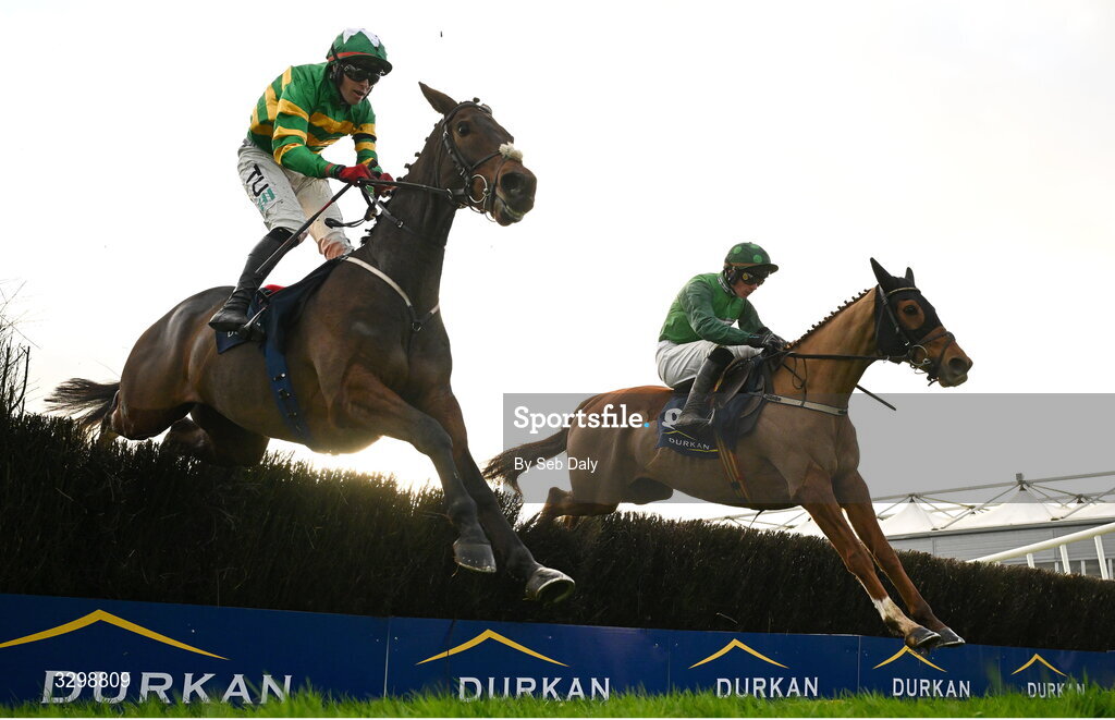 23 November 2025; Inothewayurthinkin, left, with Keith Donoghue up, and James du Berlais, right, with Danny Gilligan up, during the John Durkan Memorial Punchestown Steeplechase on day two of the Punchestown Premiere Weekend at Punchestown Racecourse in Kildare. Photo by Seb Daly/Sportsfile