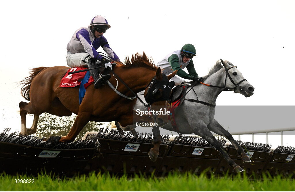 23 November 2025; Custom Taylor, left, with Michael John Kenneally up, and Millstream Lady, right, with Calum Hogan up, during the Pertemps Network Group Handicap Hurdle Qualifier on day two of the Punchestown Premiere Weekend at Punchestown Racecourse in Kildare. Photo by Seb Daly/Sportsfile