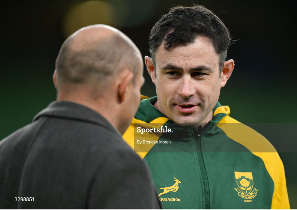 22 November 2025; South Africa assistant coach Felix Jones, right, in conversation with Ulster general manager Rory Best before the Quilter Nations Series 2025 match between Ireland and South Africa at the Aviva Stadium in Dublin. Photo by Brendan Moran/Sportsfile