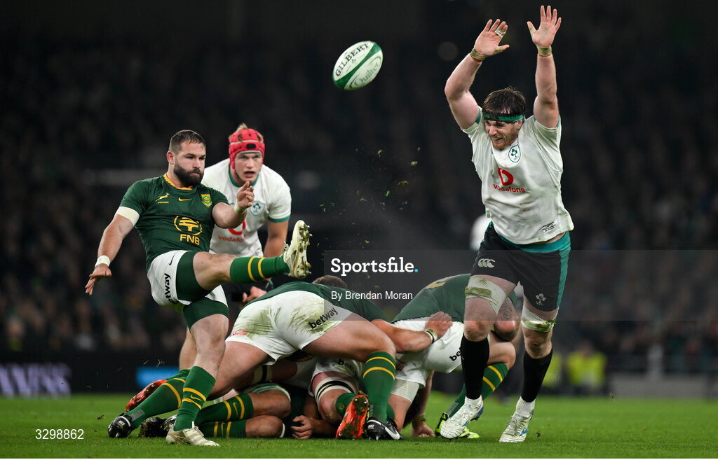 22 November 2025; Cobus Reinach of South Africa clears under pressure from Ryan Baird of Ireland during the Quilter Nations Series 2025 match between Ireland and South Africa at the Aviva Stadium in Dublin. Photo by Brendan Moran/Sportsfile