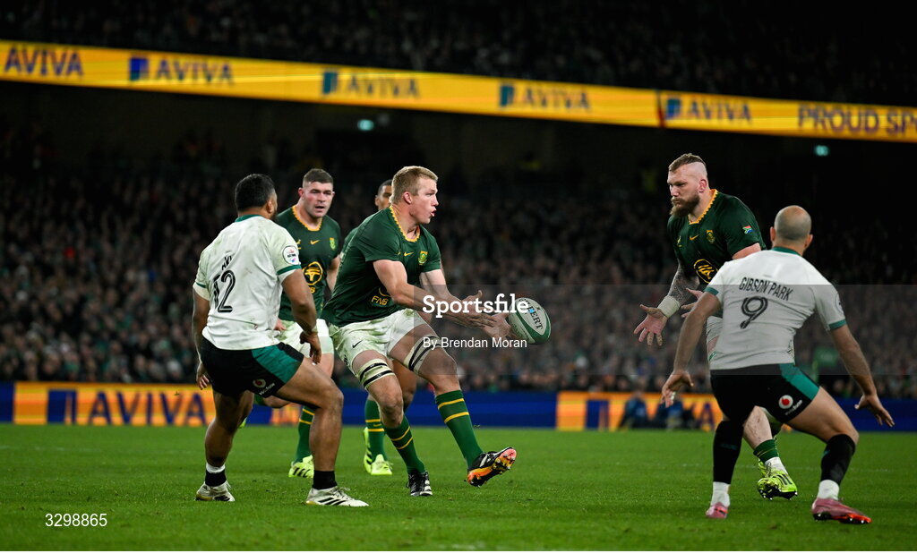 22 November 2025; Pieter-Steph du Toit of South Africa passes to teammate RG Snyman during the Quilter Nations Series 2025 match between Ireland and South Africa at the Aviva Stadium in Dublin. Photo by Brendan Moran/Sportsfile