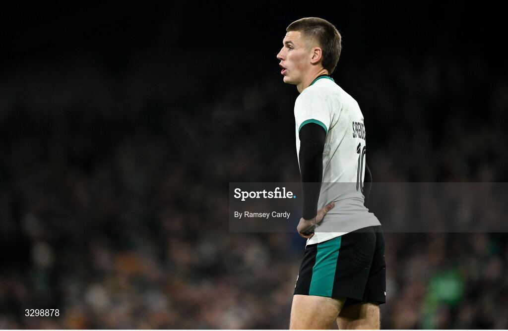 22 November 2025; Sam Prendergast of Ireland during the Quilter Nations Series 2025 match between Ireland and South Africa at the Aviva Stadium in Dublin. Photo by Ramsey Cardy/Sportsfile