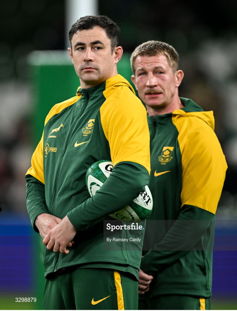 22 November 2025; South Africa assistant coaches Felix Jones, left, and Jerry Flannery before the Quilter Nations Series 2025 match between Ireland and South Africa at the Aviva Stadium in Dublin. Photo by Ramsey Cardy/Sportsfile