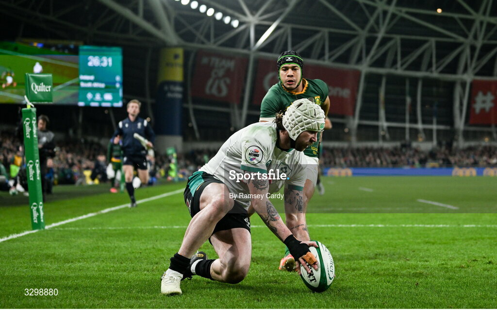 22 November 2025; Mack Hansen of Ireland during the Quilter Nations Series 2025 match between Ireland and South Africa at the Aviva Stadium in Dublin. Photo by Ramsey Cardy/Sportsfile