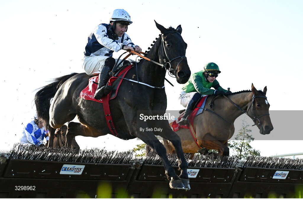 23 November 2025; Bally Free, with Jordan Gainford up, during the Irish Stallion Farms EBF Maiden Hurdle on day two of the Punchestown Premiere Weekend at Punchestown Racecourse in Kildare. Photo by Seb Daly/Sportsfile