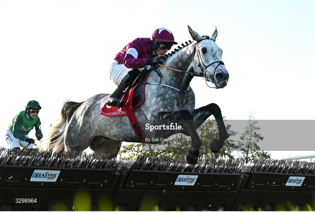 23 November 2025; He Can't Dance, with Danny Gilligan up, during the Irish Stallion Farms EBF Maiden Hurdle on day two of the Punchestown Premiere Weekend at Punchestown Racecourse in Kildare. Photo by Seb Daly/Sportsfile
