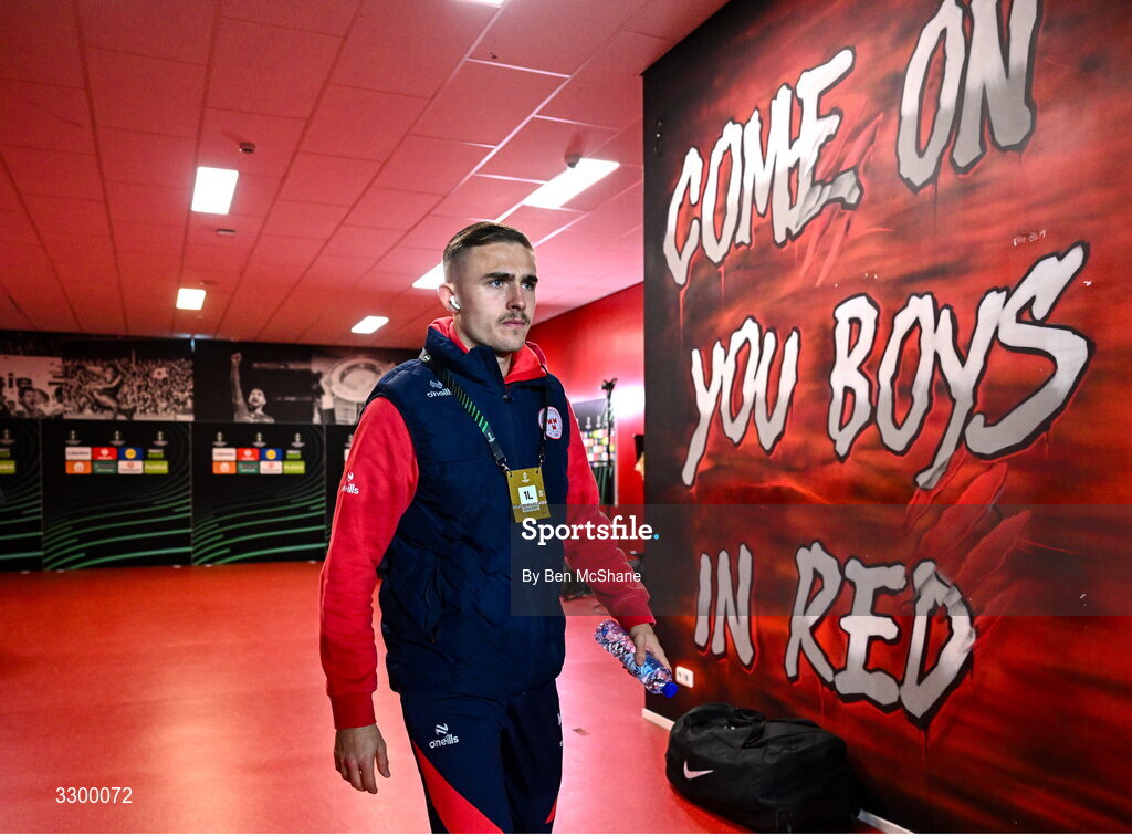 27 November 2025; Evan Caffrey of Shelbourne before the UEFA Conference League 2025/26 league phase match between AZ Alkmaar and Shelbourne at AFAS Stadion in Alkmaar, Netherlands. Photo by Ben McShane/Sportsfile