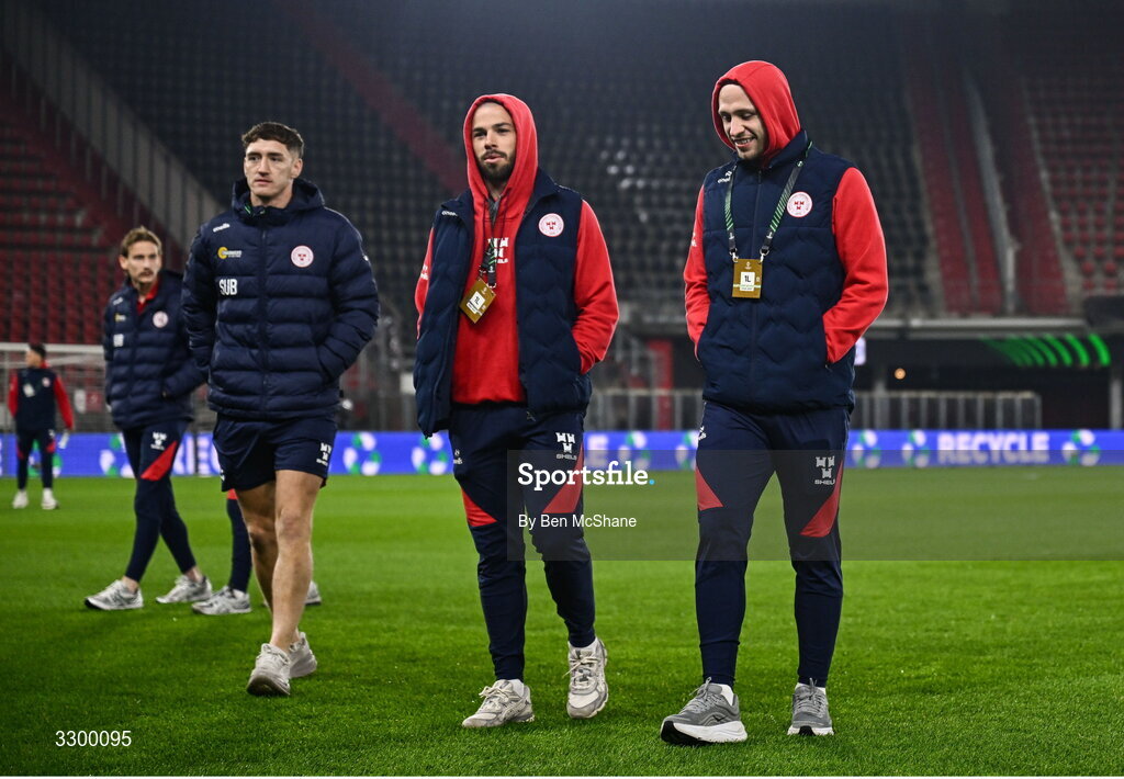 27 November 2025; Shelbourne players, from left, John Martin, Mark Coyle and Kerr McInroy before the UEFA Conference League 2025/26 league phase match between AZ Alkmaar and Shelbourne at AFAS Stadion in Alkmaar, Netherlands. Photo by Ben McShane/Sportsfile