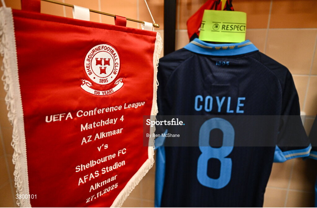 27 November 2025; The jersey of Mark Coyle hangs in the Shelbourne dressing room alongside the captains armband and pennant before the UEFA Conference League 2025/26 league phase match between AZ Alkmaar and Shelbourne at AFAS Stadion in Alkmaar, Netherlands. Photo by Ben McShane/Sportsfile