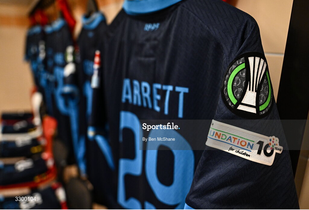 27 November 2025; UEFA badges are seen on the jersey of Paddy Barrett of Shelbourne in the Shelbourne dressing room before the UEFA Conference League 2025/26 league phase match between AZ Alkmaar and Shelbourne at AFAS Stadion in Alkmaar, Netherlands. Photo by Ben McShane/Sportsfile