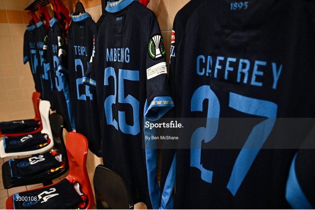 27 November 2025; The jersey of Milan Mbeng, left and Evan Caffrey hang in the Shelbourne dressing room before the UEFA Conference League 2025/26 league phase match between AZ Alkmaar and Shelbourne at AFAS Stadion in Alkmaar, Netherlands. Photo by Ben McShane/Sportsfile