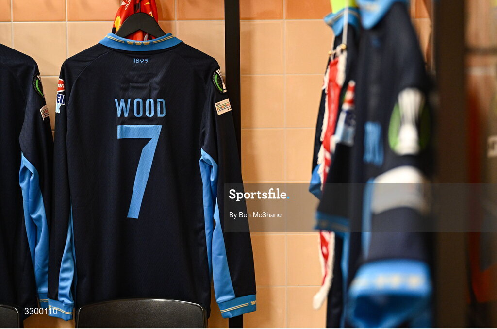 27 November 2025; The jersey of Harry Wood hangs in the Shelbourne dressing room before the UEFA Conference League 2025/26 league phase match between AZ Alkmaar and Shelbourne at AFAS Stadion in Alkmaar, Netherlands. Photo by Ben McShane/Sportsfile
