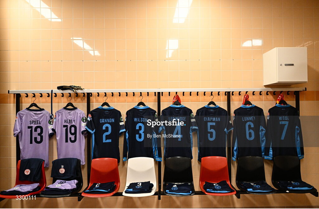 27 November 2025; The jerseys of, from left, goalkeeper Wessel Speel, goalkeeper Lorcan Healy, Sean Gannon, Tyreke Wilson, Kameron Ledwidge, Ellis Chapman, JJ Lunney and Harry Wood hang in the Shelbourne dressing room before the UEFA Conference League 2025/26 league phase match between AZ Alkmaar and Shelbourne at AFAS Stadion in Alkmaar, Netherlands. Photo by Ben McShane/Sportsfile