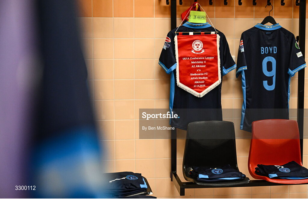 27 November 2025; The jerseys of Mark Coyle, left, and Sean Boyd hang in the Shelbourne dressing room alongside the captains armband and pennant before the UEFA Conference League 2025/26 league phase match between AZ Alkmaar and Shelbourne at AFAS Stadion in Alkmaar, Netherlands. Photo by Ben McShane/Sportsfile