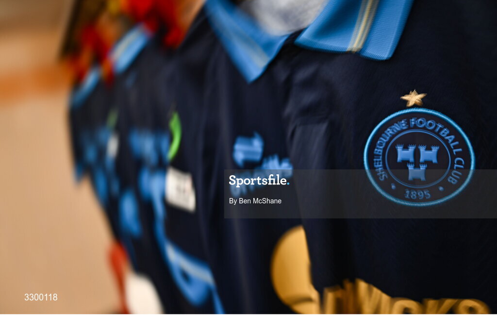 27 November 2025; A general view of a Shelbourne crest on a jerey before the UEFA Conference League 2025/26 league phase match between AZ Alkmaar and Shelbourne at AFAS Stadion in Alkmaar, Netherlands. Photo by Ben McShane/Sportsfile
