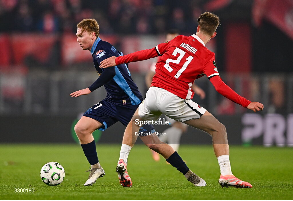 27 November 2025; Jack Henry-Francis of Shelbourne in action against Dave Kwakman of AZ Alkmaar during the UEFA Conference League 2025/26 league phase match between AZ Alkmaar and Shelbourne at AFAS Stadion in Alkmaar, Netherlands. Photo by Ben McShane/Sportsfile