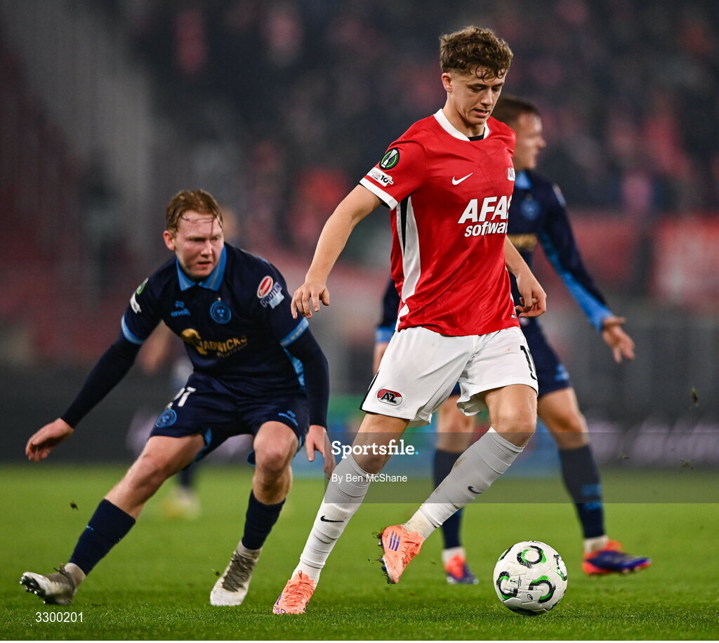 27 November 2025; Sven Mijnans of AZ Alkmaar in action against Jack Henry-Francis of Shelbourne during the UEFA Conference League 2025/26 league phase match between AZ Alkmaar and Shelbourne at AFAS Stadion in Alkmaar, Netherlands. Photo by Ben McShane/Sportsfile
