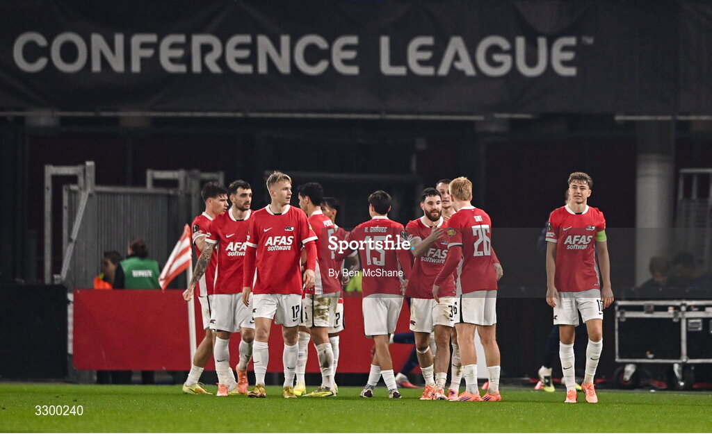 27 November 2025; Mees de Wit of AZ Alkmaar, centre, celebrates with teammates after scoring their side's first goal during the UEFA Conference League 2025/26 league phase match between AZ Alkmaar and Shelbourne at AFAS Stadion in Alkmaar, Netherlands. Photo by Ben McShane/Sportsfile
