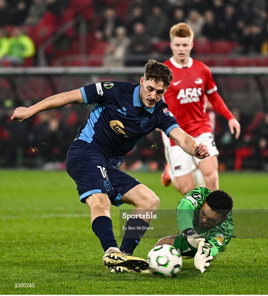 27 November 2025; John Martin of Shelbourne has a shot on goal saved by AZ Alkmaar goalkeeper Rome-Jayden Owusu-Oduroduring the UEFA Conference League 2025/26 league phase match between AZ Alkmaar and Shelbourne at AFAS Stadion in Alkmaar, Netherlands. Photo by Ben McShane/Sportsfile