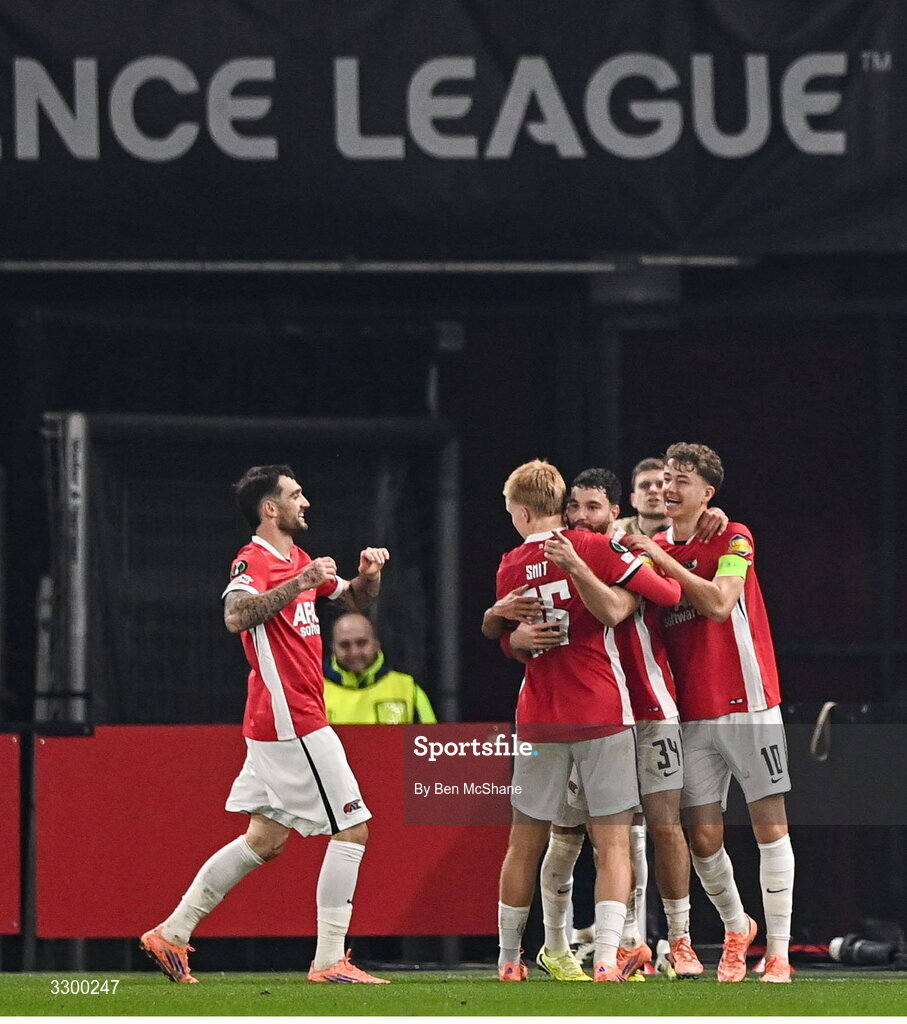 27 November 2025; Mees de Wit of AZ Alkmaar, centre, celebrates with teammates Troy Parrott, left, after scoring their side's first goal during the UEFA Conference League 2025/26 league phase match between AZ Alkmaar and Shelbourne at AFAS Stadion in Alkmaar, Netherlands. Photo by Ben McShane/Sportsfile